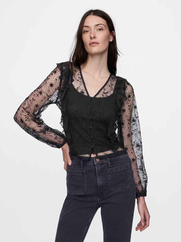 Delicate black lace with romantic ruffle details defines this fitted cropped top. Featuring long sheer sleeves and a flattering V-neckline, it adds a chic and elegant touch to any outfit. Button closures down the front enhance its sophisticated style. Ideal for casual outings, date nights, or girls' nights, this versatile piece transitions effortlessly across spring, autumn, and all-weather wardrobes.