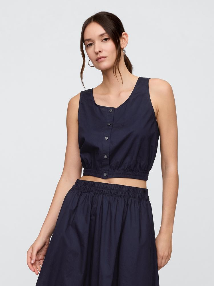 Crisp matte navy poplin fabric shapes this cropped top with a relaxed regular fit and sleeveless wide straps. The classic scoop neck and front button closure add minimalist charm, while the cropped length pairs perfectly with high-waisted bottoms. Ideal for casual outings, brunch dates, or everyday wear, this versatile piece transitions seamlessly through spring and summer seasons with a casual chic vibe.