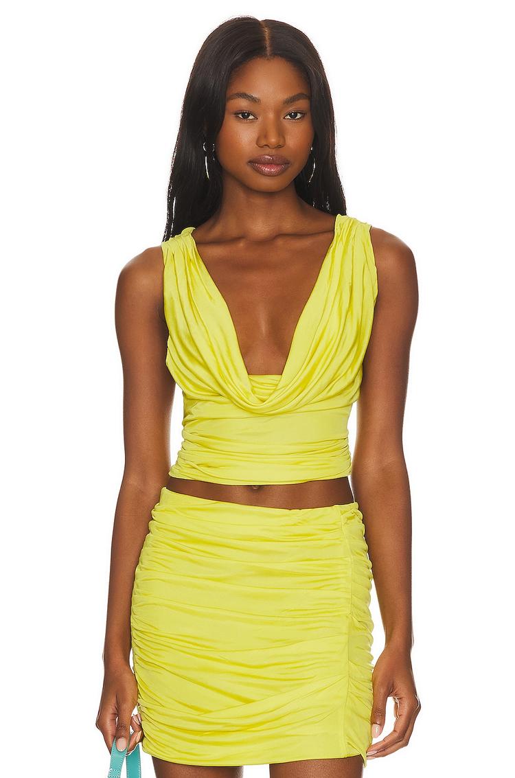 Exaggerated draping and a criss-cross back design define this fitted cropped top in a bright yellow viscose jersey. The sleeveless style features wide straps and a plunging draped neckline, perfect for warmer seasons. Its chic and trendy silhouette suits casual outings, date nights, and vibrant evenings out. Crafted for a flattering fit with a pullover closure, this top pairs effortlessly with skirts or high-waisted pants to create a statement look with a sexy edge.