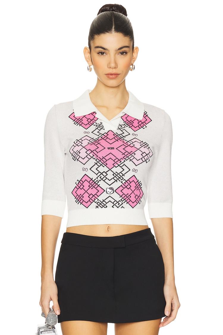 A charming cropped polo crafted from lightweight viscose knit, featuring a slim fit and classic polo collar with three-quarter regular sleeves. The front displays a vibrant pink and black argyle pattern that adds a playful, preppy touch to this white top. Perfect for casual outings, brunch dates, or everyday wear in spring and summer, this polo blends cute style with comfortable fabric, making it a versatile addition to any wardrobe.