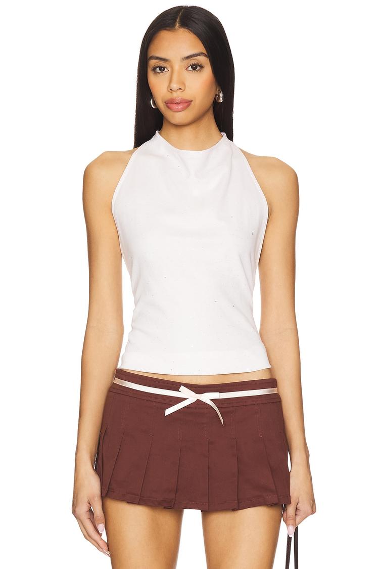 Lightweight cotton-nylon blend fabric with a subtle shimmer detail brings a fresh vibe to this slim-fit tank. Featuring a halter neck with button closure and an open back, this waist-length top combines minimalist elegance with a chic edge. Its semi-sheer jersey texture adds an alluring touch, making it perfect for casual outings, brunch dates, or summer evenings. The glitter embellishments across the fabric create a delicate sparkle that elevates simple style into standout sophistication.