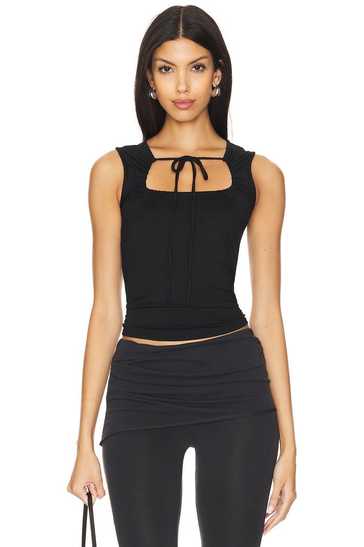 A sleek black fitted tank top crafted from soft, stretchy modal and elastane blend offers a comfortable yet flattering silhouette. Its sleeveless design features wide straps and a distinctive square neckline with a subtle drawstring tie, adding a hint of casual elegance. The brushed jersey fabric enhances softness, making it ideal for spring and summer days. This waist-length top pairs effortlessly with various bottoms, perfect for casual outings, everyday wear, or brunch dates, combining minimalist style with versatile comfort.