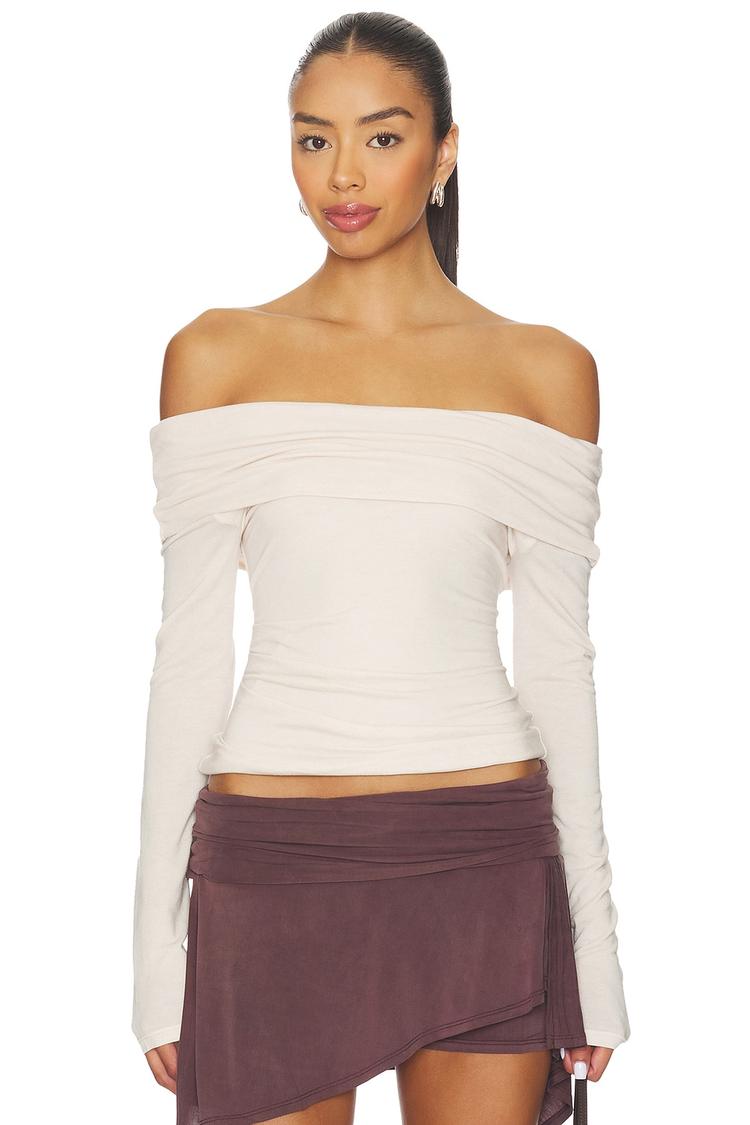Soft off-white jersey fabric with a blend of lyocell, wool, and spandex creates a lightweight, slim-fitting off-shoulder top. The long sleeves and pullover style emphasize its minimalist and casual chic vibe, perfect for spring and autumn wear. This waist-length Laura Top offers versatile wearability, ideal for casual outings, everyday errands, or relaxed brunches. Its clean silhouette and subtle stretch ensure comfortable elegance while maintaining a modern, refined look.