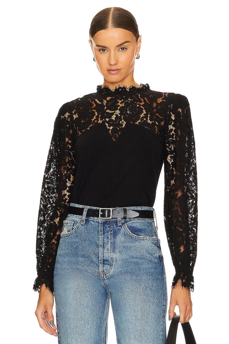 Delicate lace puff sleeves with eyelash trim and a high neckline bring a timeless elegance to this black blouson top. The jersey fabric bodice offers a comfortable regular fit that hits at hip length, perfect for layering or standalone wear. Crafted from a cotton-nylon blend with rayon-spandex lining, it provides both softness and slight stretch. Ideal for casual outings, brunch dates, or romantic evenings, this top blends classic style with modern comfort effortlessly.