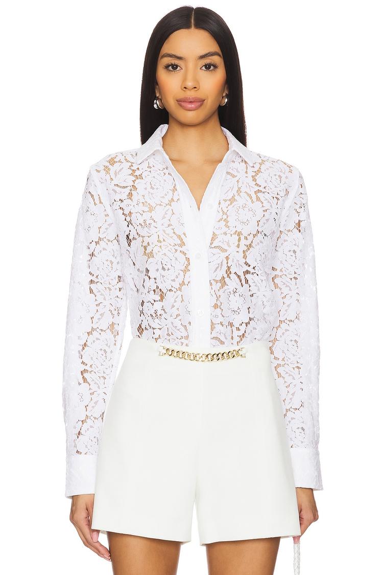 Delicate lace fabric and a classic V-neck combine effortlessly in this elegant shell top. Featuring long sleeves with a regular fit and a front button closure, the hip-length silhouette offers a sophisticated yet comfortable style. The semi-sheer design adds a modern touch, perfect for layering over your favorite camisole. Ideal for casual outings, workwear, and business casual occasions, this white lace top brings timeless charm to your wardrobe with versatile wearability from brunch dates to evening affairs.
