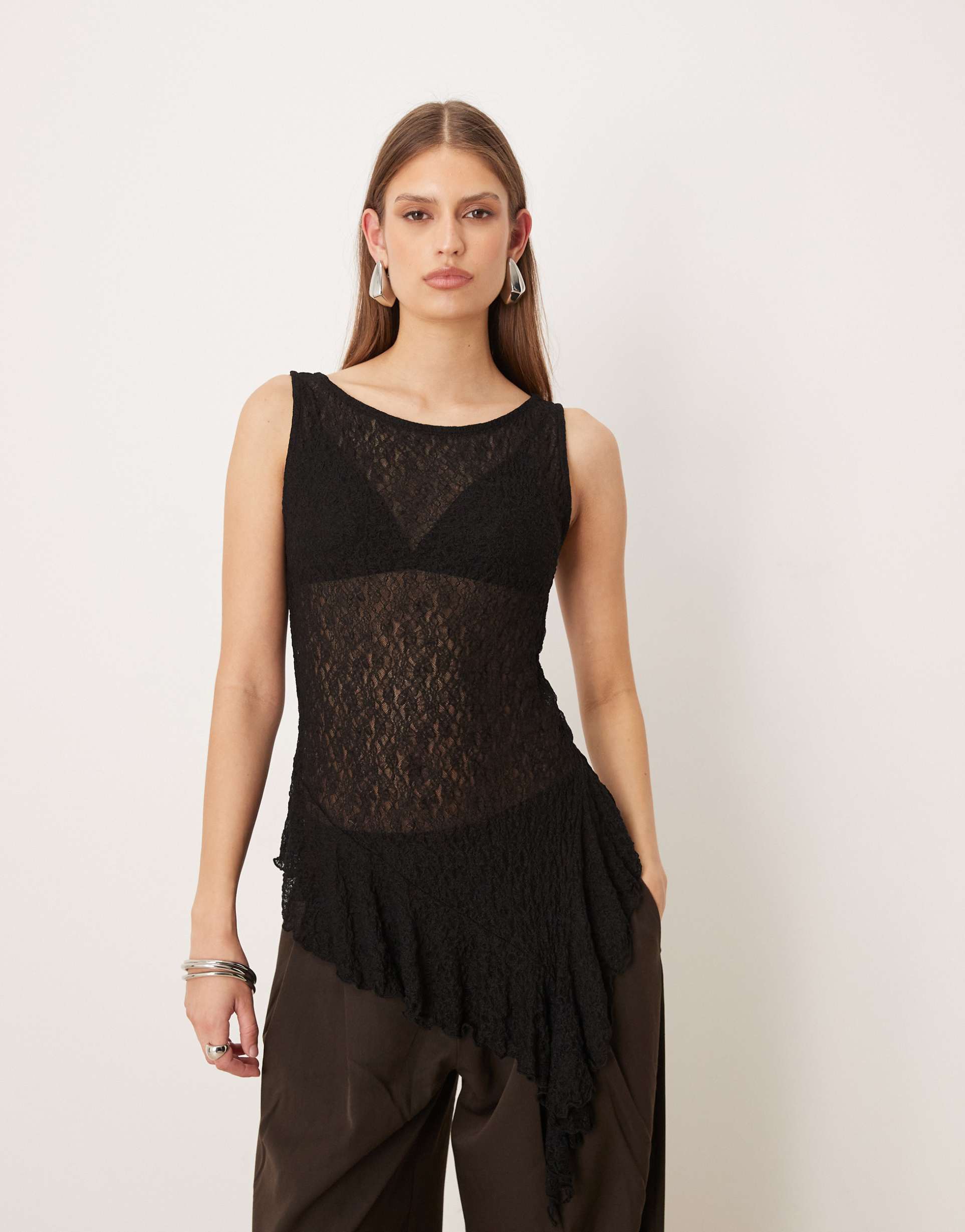Delicate lace fabric and an asymmetric hem combine to create this elegant sleeveless top featuring a classic round neck and regular fit. Crafted from 100% polyester, its drapey silhouette offers a modern and chic look perfect for casual outings, brunches, or night outs. The solid black color enhances its versatile appeal, making it a stylish choice for spring and summer wardrobes.