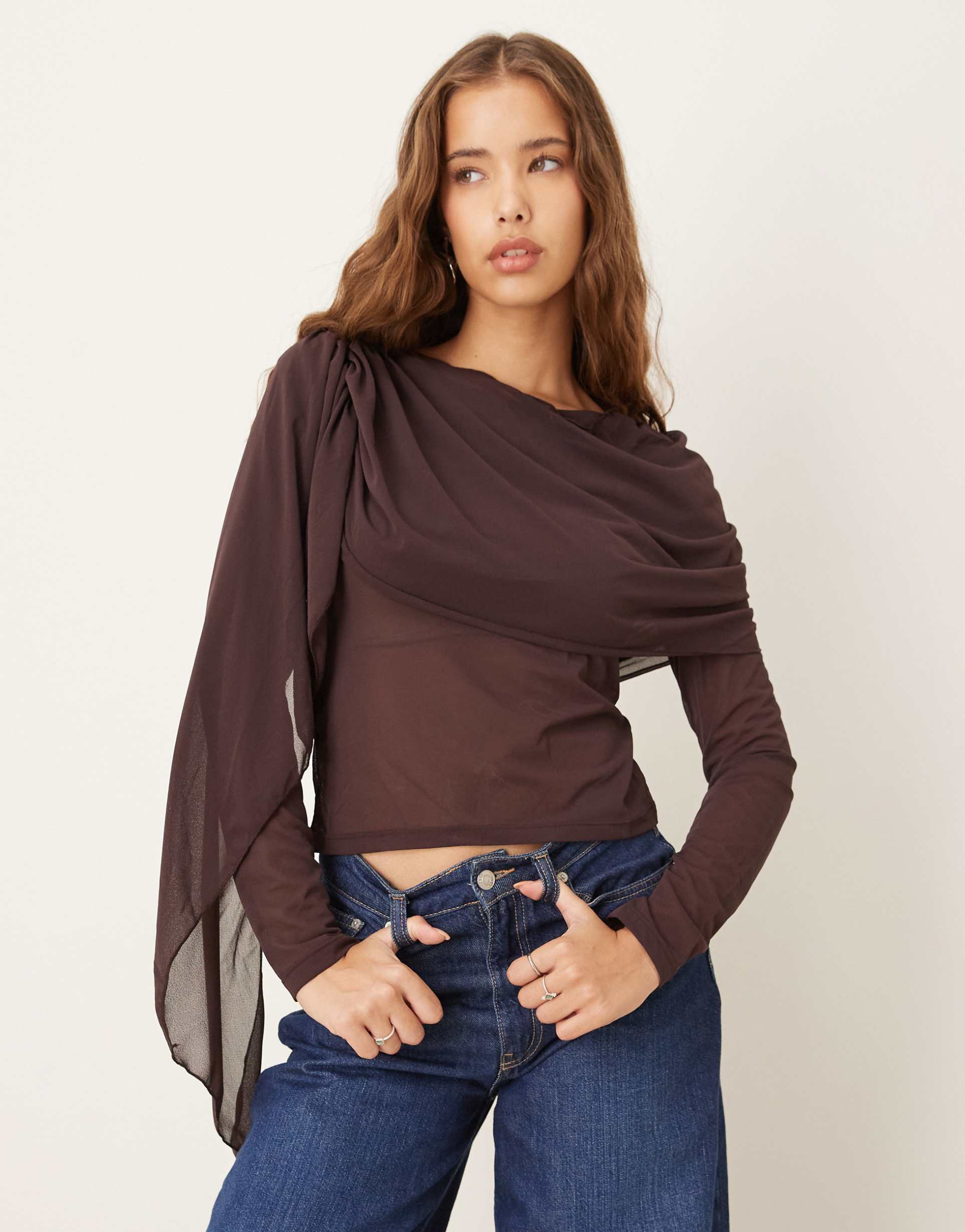 Soft matte brown polyester forms a sheer, cropped cape top featuring elegant draping and ruched details across the front and sleeves. The boat neckline enhances its modern chic silhouette, paired with long regular sleeves for a balanced look. Designed with a regular fit, this versatile top suits casual days, brunches, and night outs, blending comfort with sophistication. Its fine mesh fabric lends a delicate transparency, making it a standout piece for transitional seasons and all-weather wear.
