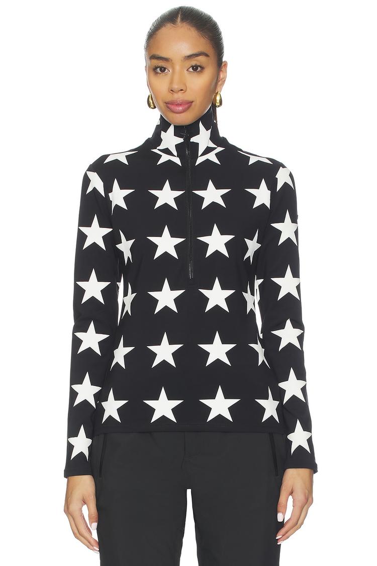 Bold star prints adorn this tapered fit pullover crafted from a polyester-elastane blend for warmth and stretch. Featuring a high neck with a convenient quarter zip closure, long sleeves, and hip-length hem, it offers sporty chic appeal perfect for winter outings, casual wear, and travel adventures. The all-over star pattern on a sleek black base adds a modern, dynamic vibe to your cold-weather wardrobe.