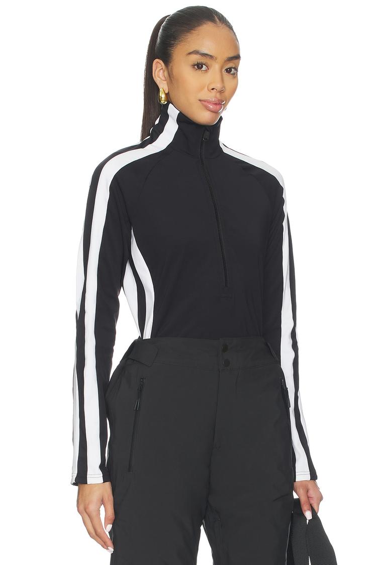Sporting a sleek matte black base with bold matte white color-blocked stripes running down the sleeves, this tapered base layer top features a high neck and a functional quarter-zip closure. Crafted from a stretchy polyester-elastane blend, it promises comfortable movement and warmth, making it ideal for winter workouts, travel, and outdoor activities. Its minimalist sporty chic style and hip-length cut ensure you stay stylish whether hitting the slopes or layering for casual athleisure looks.