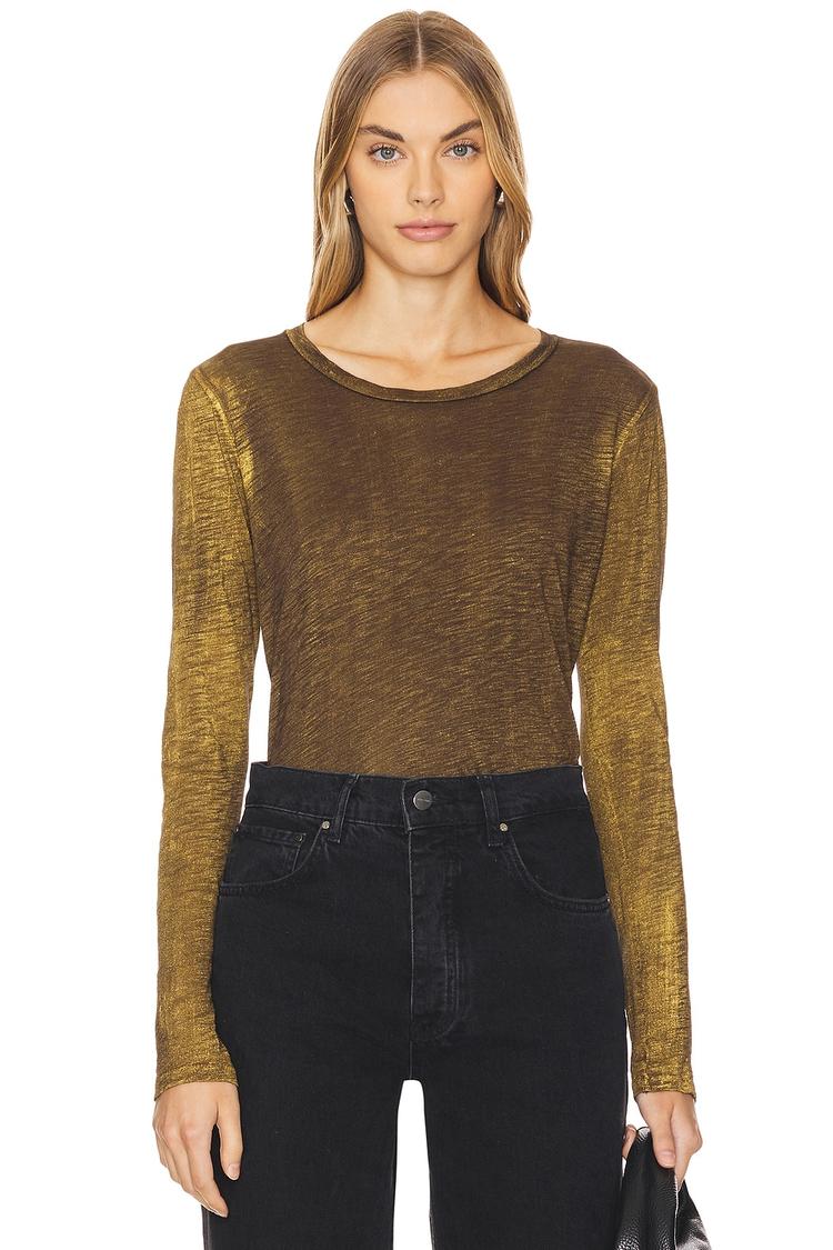 Metallic threading adds a subtle shimmer to this classic long sleeve shell top crafted from lightweight cotton jersey. Featuring a regular fit and a timeless round neckline, its hip-length silhouette and covered back make it versatile for casual days, everyday wear, and business casual settings. The elegant metallic dark gold hue elevates simple styling with a chic, minimalist edge, perfect for layering or wearing solo during all seasons. Comfortable and effortlessly stylish, this top balances understated luxury with practical wearability.