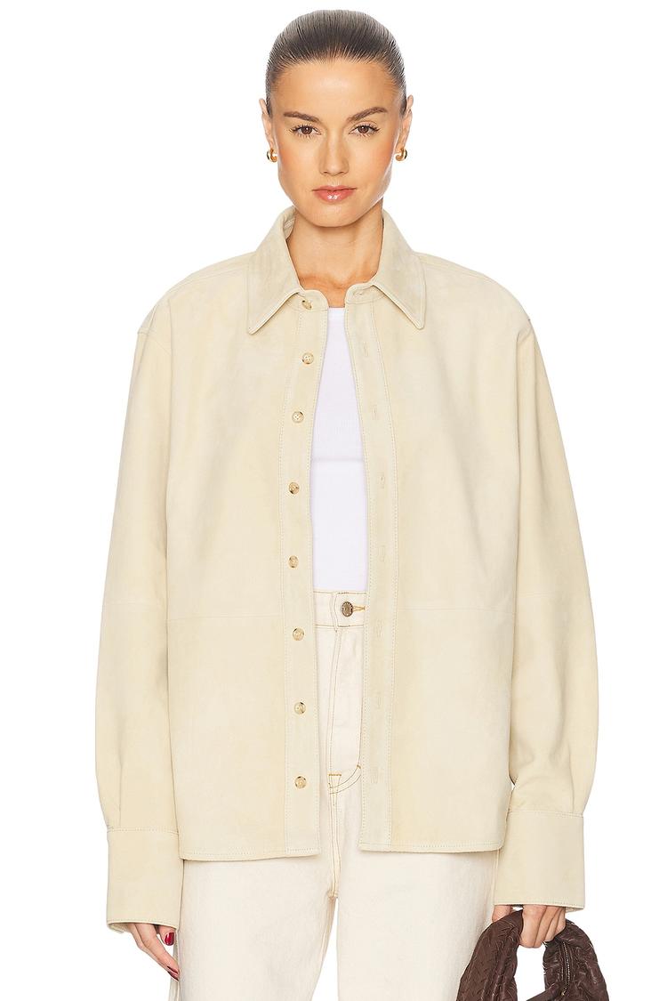 Midweight suede leather in a matte beige hue defines this shacket with a relaxed regular fit and hip-length silhouette. Featuring a classic pointed collar, long regular sleeves with button cuffs, and a front button closure, it offers a minimalist and modern aesthetic perfect for casual, streetwear, or travel wardrobes. Its covered back and solid color make it an easy layering piece for cooler seasons like autumn, winter, and spring. This versatile leather shacket combines style and function, ideal for laid-back days or urban explorations.