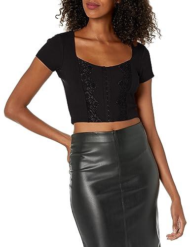 GUESS WOMEN'S SHORT SLEEVE HOOK AND EYE RIB JAMIE TOP, JET BLACK, MEDIUM