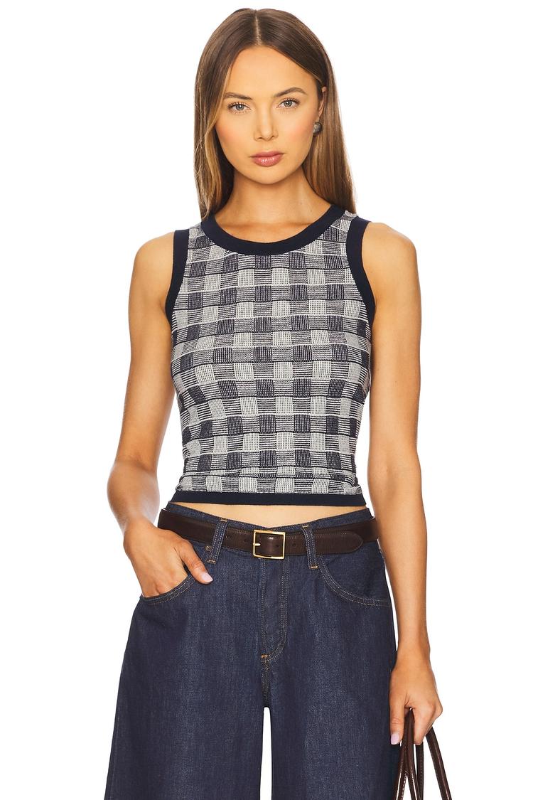 Feel effortlessly chic in a timeless check: the Guest In Residence Gingham Tank. This sleeveless, cropped knit top features a gray and navy gingham pattern with contrast navy trim at the neckline and armholes for a clean, polished line. Made in a lightweight cotton-poly knit, it pulls on easily for a flattering, fitted silhouette that pairs perfectly with high-rise denim or wide-leg jeans. The versatile, classic style works from casual days to weekend brunch, and the tidy finish makes it a go-to layering piece. A refined essential that adds preppy sophistication to any warm-weather look.