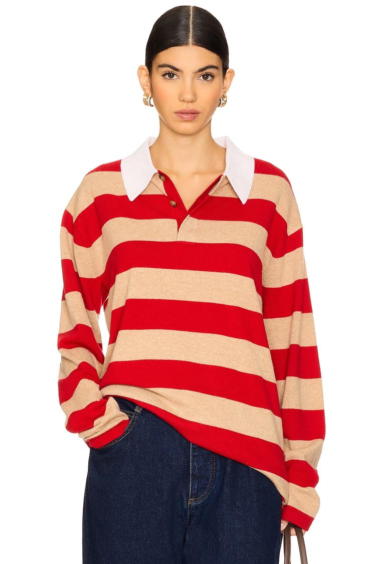 Classic stripes meet luxurious softness in this loose-fit cashmere rugby top. Featuring a traditional polo collar with partial front button closure and long sleeves, its hip-length silhouette offers relaxed comfort and timeless style. The bold red and beige stripes create a casual chic aesthetic perfect for autumn and winter days. Crafted from 100% cashmere, this slinky knit fabric brings warmth and elegance to everyday wear, ideal for casual outings, brunches, or a laid-back workwear look.