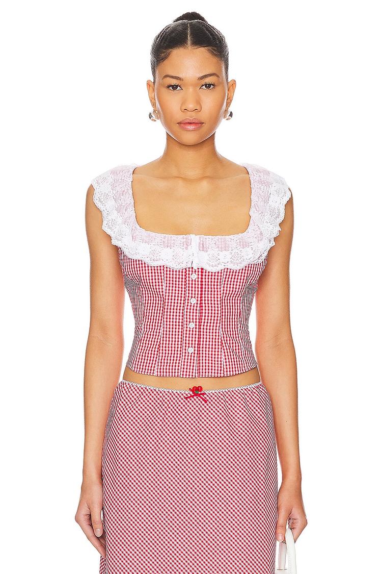 Delicate ruffle lace trim frames the square neckline of this fitted corset top, crafted in a vibrant red and white checkered cotton crepe. The sleeveless design and waist-length cut enhance its classic, romantic silhouette, secured with front button closure for a refined finish. Perfect for spring and summer outings, this top effortlessly suits casual days, brunch dates, or intimate evenings, bringing a touch of elegance and timeless style to your wardrobe.