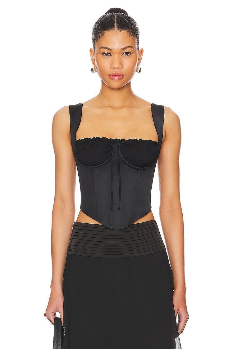 A sleek matte black corset with a cropped length and fitted silhouette, this bustier top features ruched cup detailing and a square neckline that enhances its chic appeal. The wide straps are adjustable for a perfect fit, complemented by a boned bodice and unpadded underwire cups for structure. Finished with a back hook and eye closure and a drawstring tie at the neckline, this versatile piece is crafted from a smooth polyester, spandex, viscose, and rayon blend. Ideal for casual outings, date nights, or girls’ nights, it blends sexy and sophisticated style effortlessly.