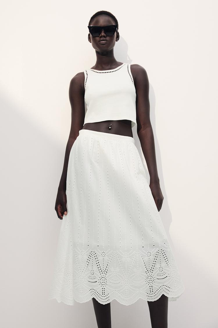Soft ribbed cotton jersey shapes this fitted cropped tank top featuring delicate ladder lace trims along the neckline and armholes. Its sleeveless design with wide straps and a classic round neck offers a minimalist yet chic silhouette, perfect for warm weather. This versatile crop top pairs effortlessly with skirts or high-waisted pants, ideal for casual outings, everyday wear, or a relaxed brunch with friends. Embrace breathable comfort and subtle feminine detailing in this essential summer piece.