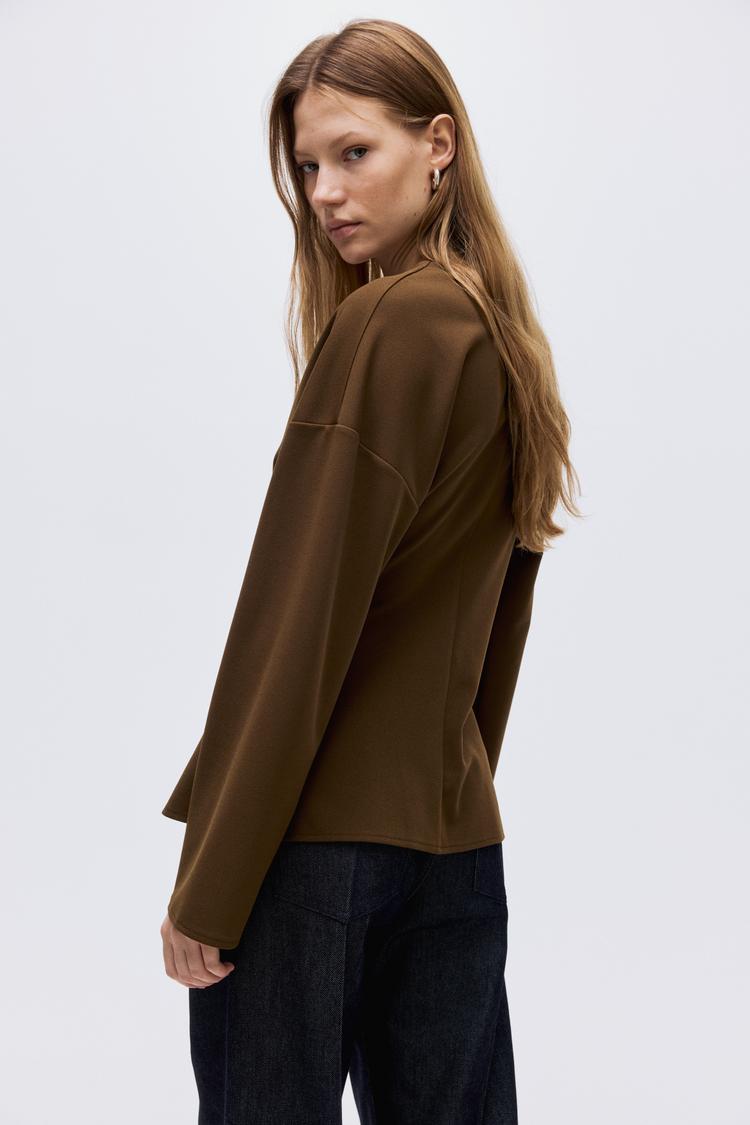 Rich matte brown woven fabric shapes this classic blouson top with a flattering V-neckline and long regular sleeves. Featuring a neat front button closure, its regular fit and hip-length hem create an elegant silhouette perfect for autumn and winter. This versatile top transitions effortlessly from casual days to polished workwear and business casual settings, embodying minimalist sophistication with timeless appeal.