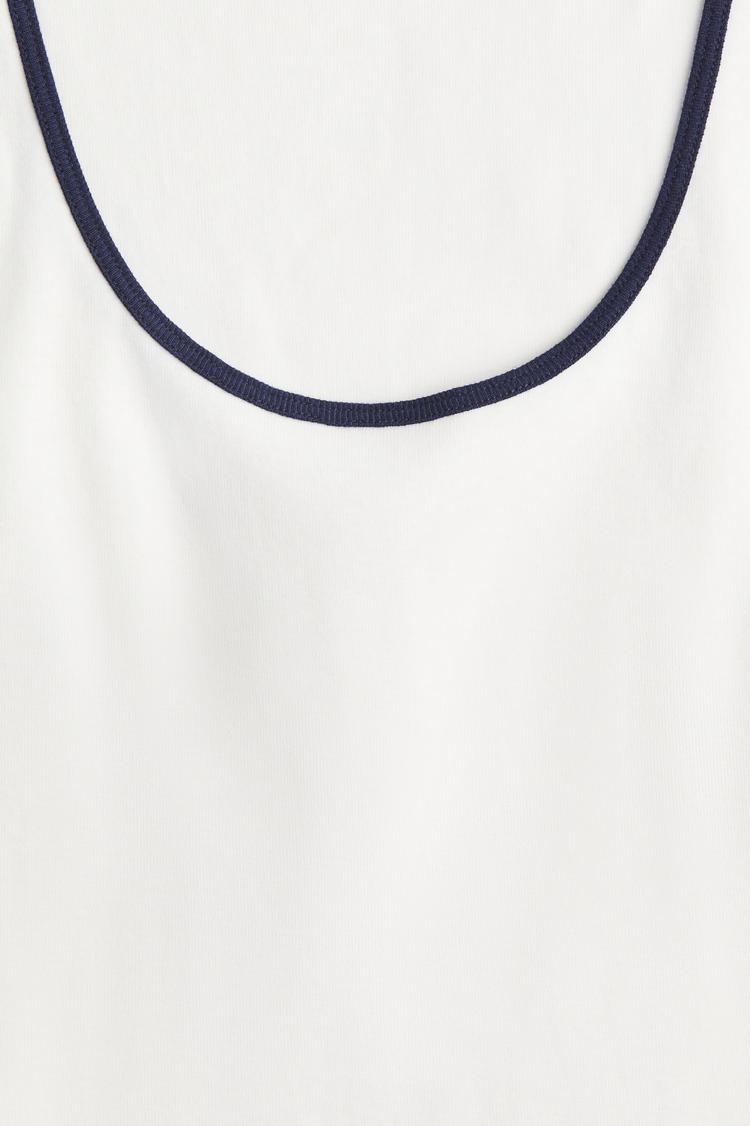 Soft cotton fabric and a clean, minimalist silhouette define this white tank top with navy trim. Featuring wide straps and a round neckline, it offers a regular fit and hip-length cut, perfect for warm spring and summer days. Its versatile design easily pairs with casual and loungewear looks, making it ideal for everyday wear or relaxed outings. The simple contrasting edging adds a subtle stylish touch while maintaining a classic, timeless appeal.