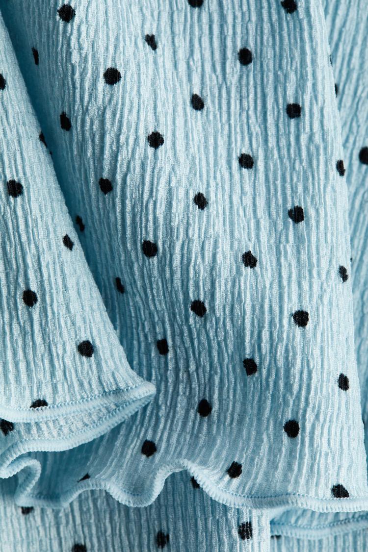Soft crinkled jersey fabric and a flattering wrap silhouette define this light blue top, dotted with playful black polka dots. The half sleeves and V-neckline create an airy, casual chic vibe, while delicate ruffles adorn the hem and sleeve edges for a romantic touch. Its waist-length fit and tie-up closure offer comfortable everyday wear, perfect for spring brunches, casual outings, or relaxed everyday looks. This cute and versatile top pairs effortlessly with denim or shorts, adding texture and charm to your warm-weather wardrobe.
