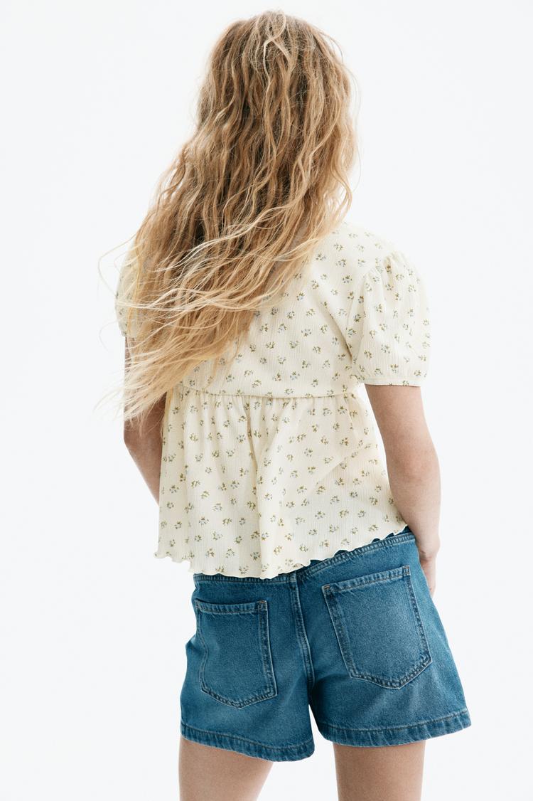 Soft off-white crinkled jersey fabric with a delicate all-over floral print creates a romantic babydoll top. Featuring a flattering V-neckline, loose fit, and half sleeves, this hip-length piece is detailed with subtle ruffles along the hem for a touch of feminine charm. Perfect for casual outings, brunch dates, or everyday wear in spring and summer, its lightweight texture and relaxed silhouette ensure comfort and style for warm-weather days.