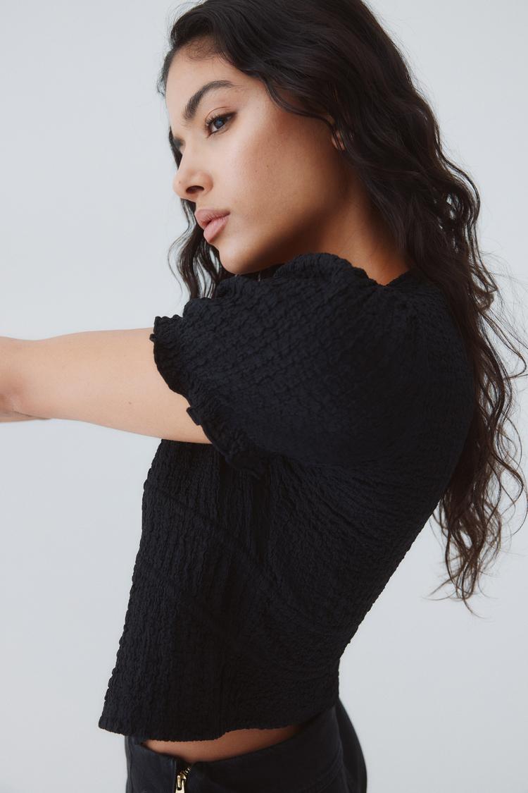 A matte black blouson top featuring a crinkled texture that adds subtle dimension to its minimalist design. The waist-length silhouette pairs a regular fit with half sleeves and a flattering V-neckline, finished with a tie-up front closure for adjustable styling. Ideal for spring, summer, and autumn, this versatile piece suits casual outings, brunch dates, and relaxed evenings, blending ease with understated chic.
