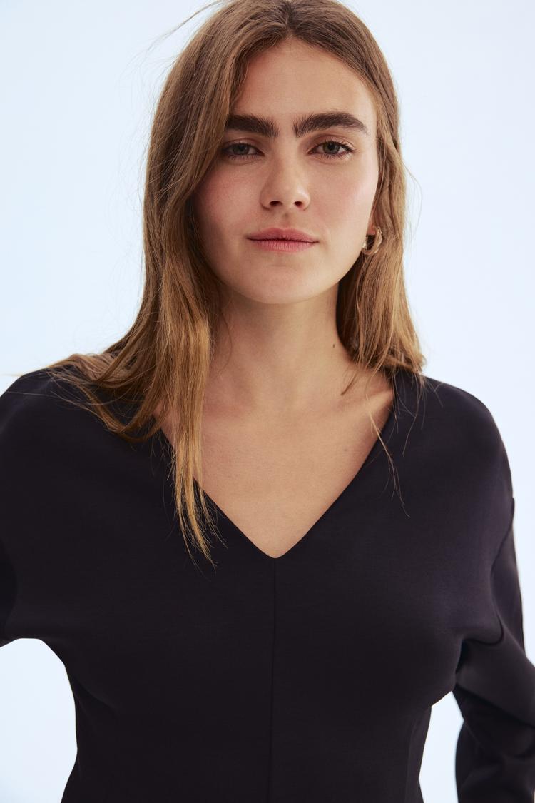 A sleek matte black scuba top designed with a defined waist that flatters the silhouette. Featuring a classic V-neck and long regular sleeves, this fitted hip-length pullover is a versatile staple for casual days, workwear, and business casual settings. The minimalist modern design complements various outfits, offering a clean and polished look with comfortable scuba fabric that provides subtle stretch and structure.