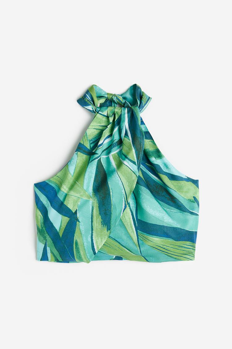 Halterneck crop top in woven viscose fabric with a slight sheen. Narrow cut at top, a sewn wrapover front for a draped effect, and a concealed zipper at one side. Lined.