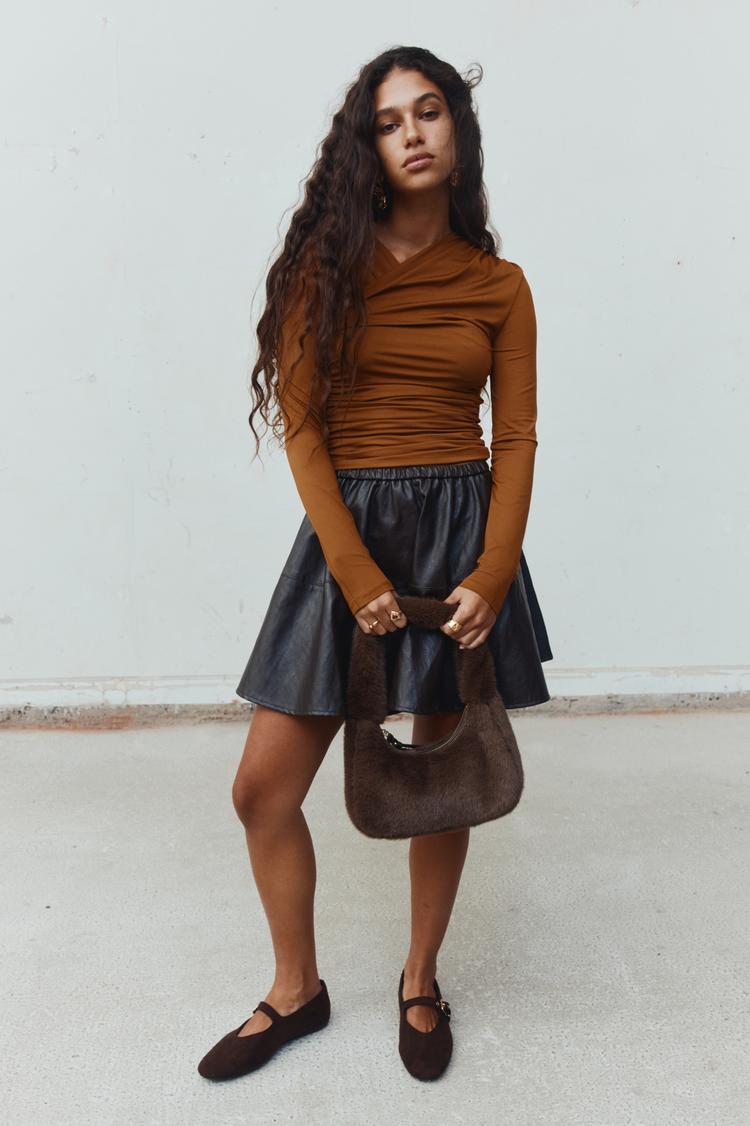 Rich matte brown jersey fabric forms a fitted blouson top featuring elegant draped neckline detailing at the front. The hip-length silhouette with long regular sleeves offers a refined, minimalist look perfect for casual settings, workwear, or business casual events. Its pullover design and stretchy fabric ensure comfort and ease, making it ideal for transitional seasons like autumn and spring. Pair this versatile top with skirts or tailored pants for brunch dates, office meetings, or relaxed evenings out.