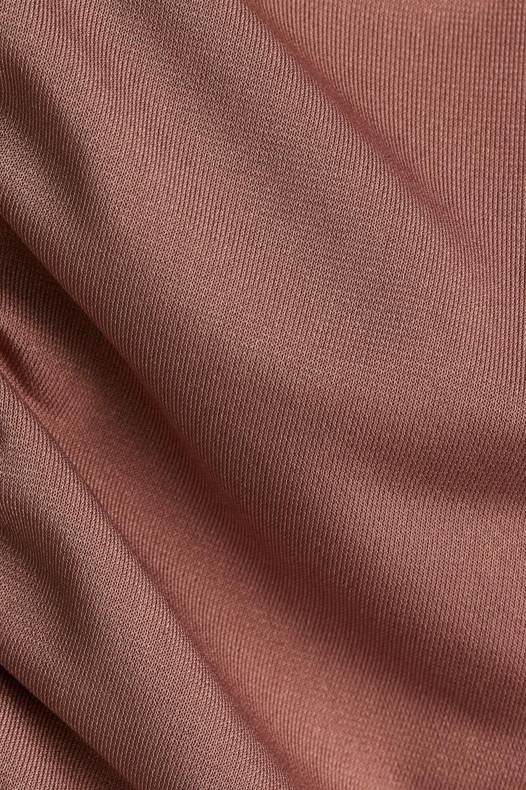 This image shows a matte dusty rose fabric with a fine woven texture, likely part of a draped long-sleeved top. The solid dusty rose shade lends a soft, muted elegance perfect for layering or standalone wear. The matte finish adds a sophisticated, understated look suitable for various occasions, though specific style and fit details are not visible.