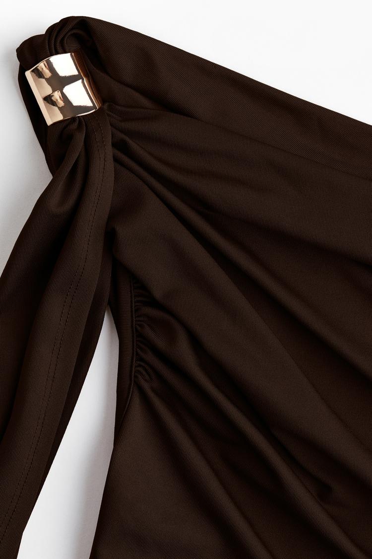 A rich matte brown draped one-shoulder top with a slim fit and sleeveless styling defines modern chic. The graceful draped neckline and single shoulder strap add a touch of sophisticated asymmetry, while the waist-length silhouette flatters the figure effortlessly. Ideal for warm spring and summer days, this versatile piece transitions seamlessly from casual outings and brunches to night out occasions. Crafted for a contemporary wardrobe, it pairs beautifully with high-waisted pants or skirts for an elegant yet trendy look.