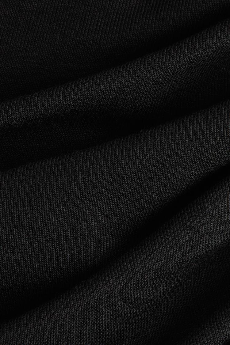 A sculptural draped neckline defines this fitted black shell top crafted from soft viscose fabric, creating an elegant silhouette with long sleeves and a waist-length hem. Its minimalist design and matte black shade bring a chic, modern edge, making it ideal for casual outings, stylish workwear, or relaxed brunches. The covered back and pullover closure enhance the sleek look and comfort, while the draped detail adds subtle sophistication to elevate everyday style.