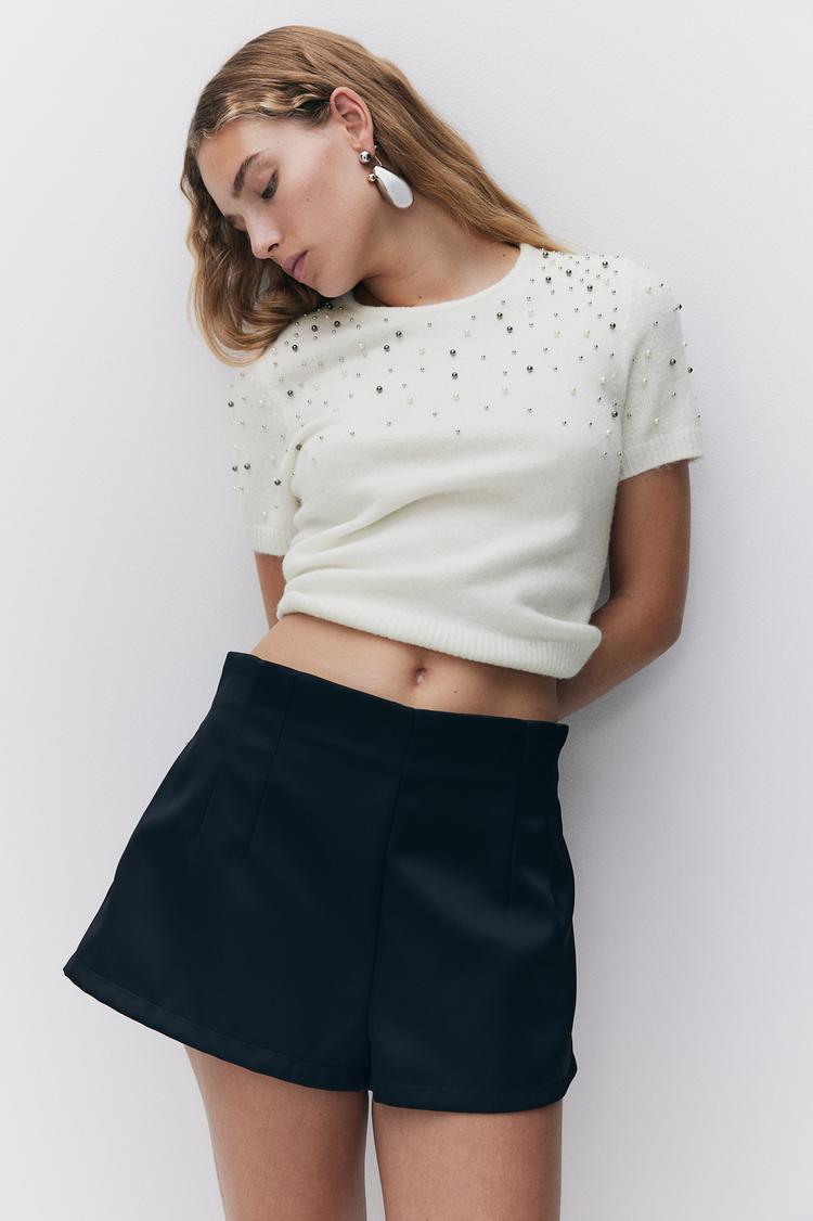 Short, fitted top in a soft, fine knit with embellishments at upper front. Round neckline, short sleeves, and ribbing at neckline, cuffs, and hem.
