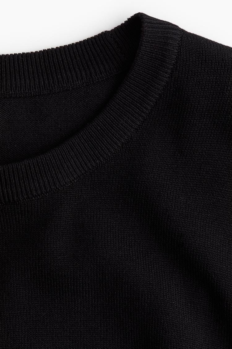 Soft viscose-blend and cotton fabric combine with fine-knit texture to create this matte black shell top. Featuring a classic round neckline, half-length sleeves with ribbed cuffs, and a ribbed hem, it offers a regular fit that is both comfortable and versatile. The covered back and pullover style enhance the minimalist design, making it an ideal choice for casual outings, workwear, and business casual settings. Its clean silhouette and ribbed detailing add subtle elegance, suited for all-season wear.