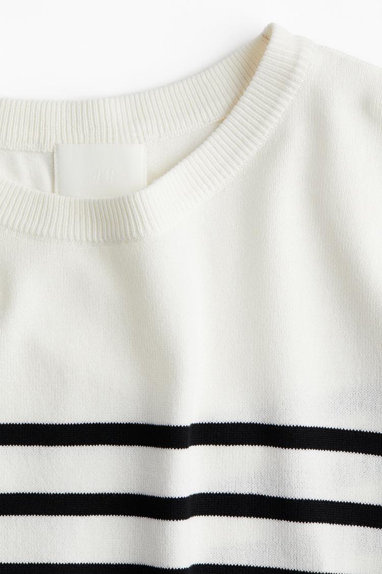 This fine-knit shell top features a timeless crew neck and half sleeves, crafted in a breathable cotton blend perfect for spring through autumn. Its classic striped pattern in black on an off-white base offers a minimalist yet chic appeal. Ribbing details at the neckline, cuffs, and hem add subtle texture, while the regular fit and hip-length cut ensure versatile comfort. Ideal for casual everyday wear, business casual settings, or relaxed brunches, this pullover top blends effortless style with practical design for multiple occasions.