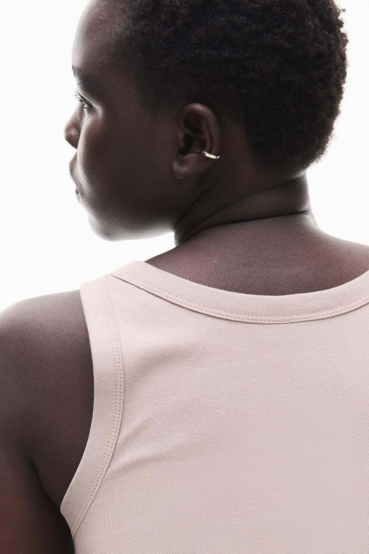 Soft taupe cotton fabric and a fitted silhouette combine to create this essential tank top. Featuring a classic round neckline and wide straps, it offers comfortable sleeveless wear with a clean covered back. Its hip-length cut and minimalist design make it versatile for casual outings, everyday layering, or relaxed loungewear. This tank top is a staple piece for warmer seasons like spring and summer, blending comfort with understated style.