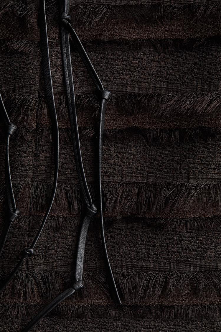 Textured with delicate fringe trim throughout, this cropped top in matte black offers a modern, chic silhouette perfect for summer days. Its sleeveless design and high neckline create a clean, polished look, while the tie-back closure adds a subtle, stylish detail. The regular fit ensures comfort and ease, making it an excellent choice for casual outings, brunch dates, or relaxed evening gatherings. Crafted to pair effortlessly with matching pieces or high-waisted bottoms, this fringe-trimmed top elevates everyday style with a touch of contemporary elegance.