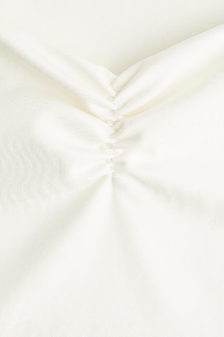 Soft white fabric and a cropped silhouette define this sleeveless top with a flattering square neckline. The fitted shape is enhanced by delicate front ruching that adds texture and visual interest. Its covered back and pullover style keep it simple yet chic. Ideal for warm weather, this minimalist piece suits casual outings, brunch dates, and vacation days with effortless style and comfort.