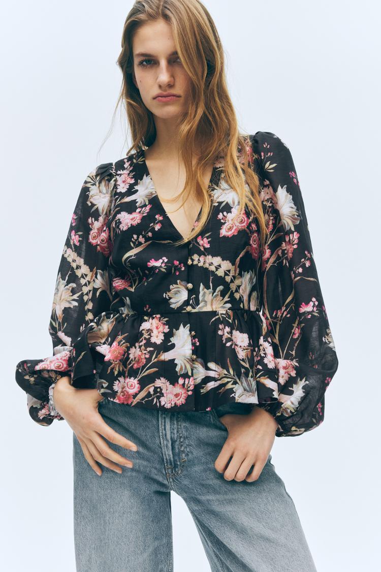 Softly structured linen blend and a romantic floral print define this peplum blouse with a flattering V-neckline and relaxed fit. The long balloon sleeves add an airy, bohemian touch, while the waist-length peplum hem enhances silhouette definition. Button closures down the front lend a classic feel to this matte black base adorned with dusty rose and beige blooms. Perfectly suited for casual outings, brunch dates, or everyday wear, this blouse blends comfort and style for spring through autumn seasons.