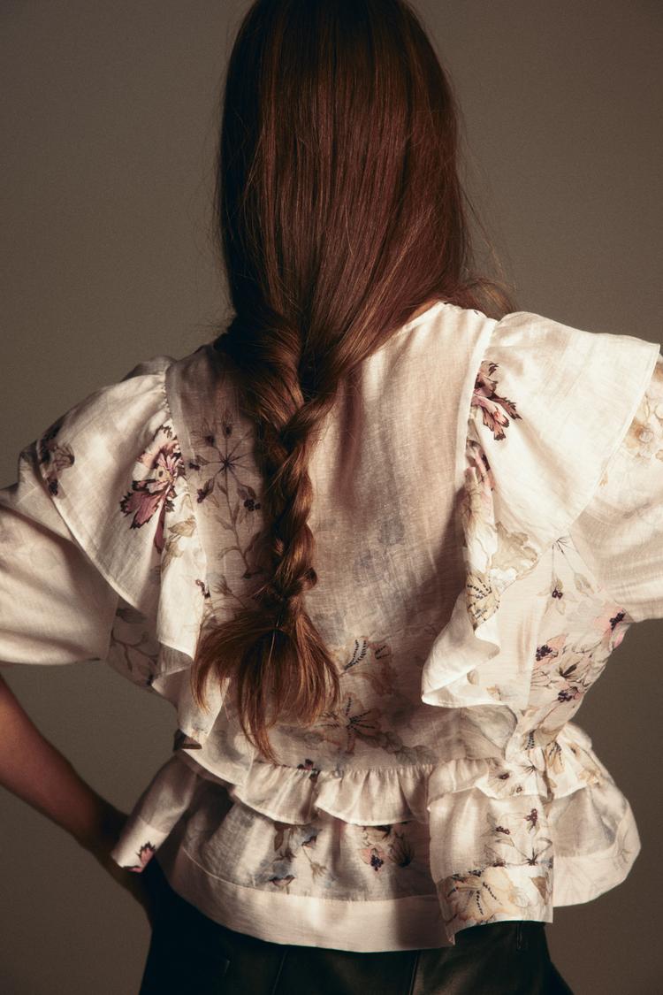 Soft linen-blend fabric with a delicate floral print and embroidered ruffle details creates a romantic peplum top that flatters with its relaxed fit and elegant V-neckline. Elbow-length regular sleeves and a waist-length hem enhance its feminine silhouette, making it a perfect choice for spring and summer outings. Ideal for casual wear, brunch dates, or everyday styling, this top offers effortless charm with subtle muted tones and airy comfort.