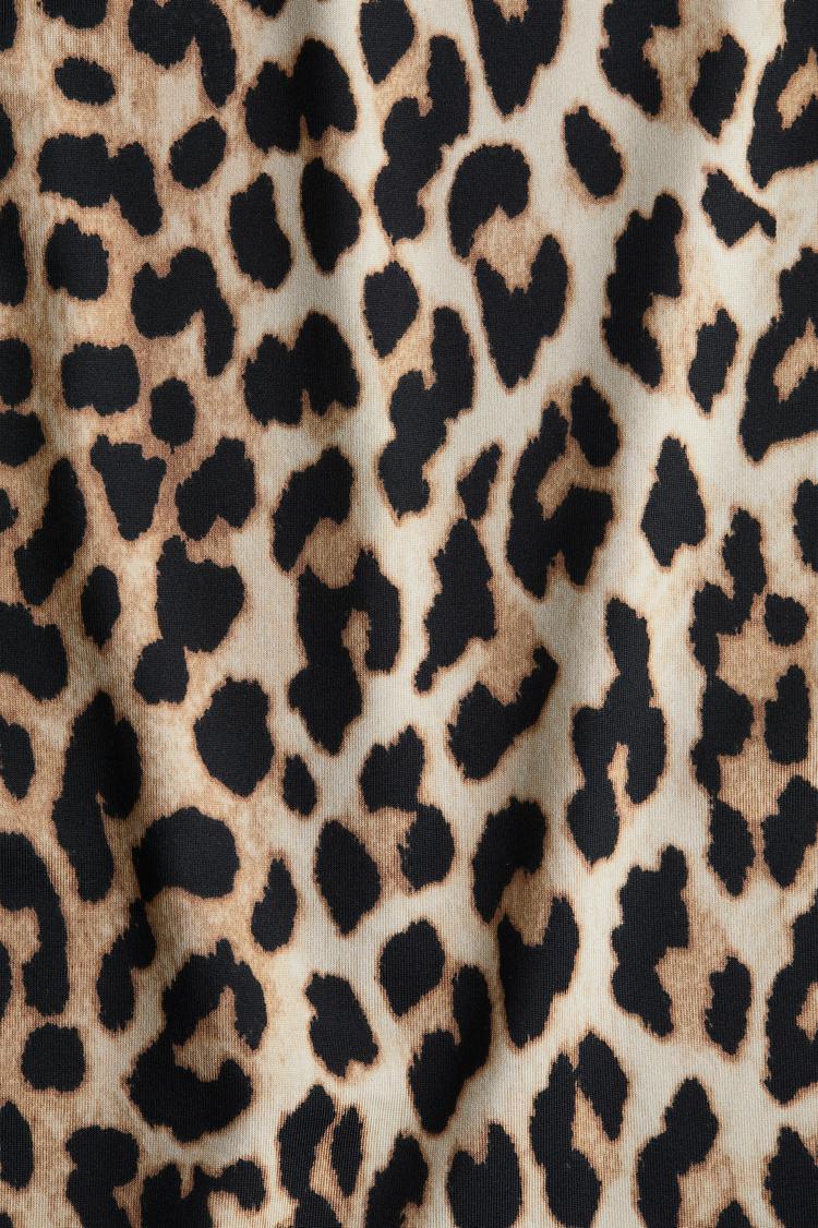 Feel fearless in this leopard-print long-sleeve jersey top. Cut in a body-skimming stretch knit, it features a classic round neckline, full-length sleeves, and a cropped, straight hem that hits at the waist. The all-over animal print on a warm beige base adds instant drama and versatility. The fitted silhouette pairs effortlessly with a high-waisted skirt or jeans for day-to-night styling. Dress it up with sleek bottoms and heels for a night out, or keep it casual with sneakers for weekend errands. A chic, modern staple that elevates any look.