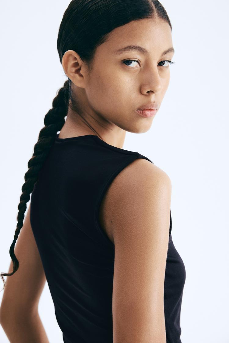 Sleek and versatile, this fitted black microfiber tank top features a classic round neck and wide straps for a clean silhouette. Its sleeveless design and waist-length cut make it perfect for warm weather, layering, or casual outings. The minimalist style ensures effortless pairing for everyday wear, travel, or relaxed brunches, offering comfort and subtle elegance with a matte black finish that suits a variety of looks.