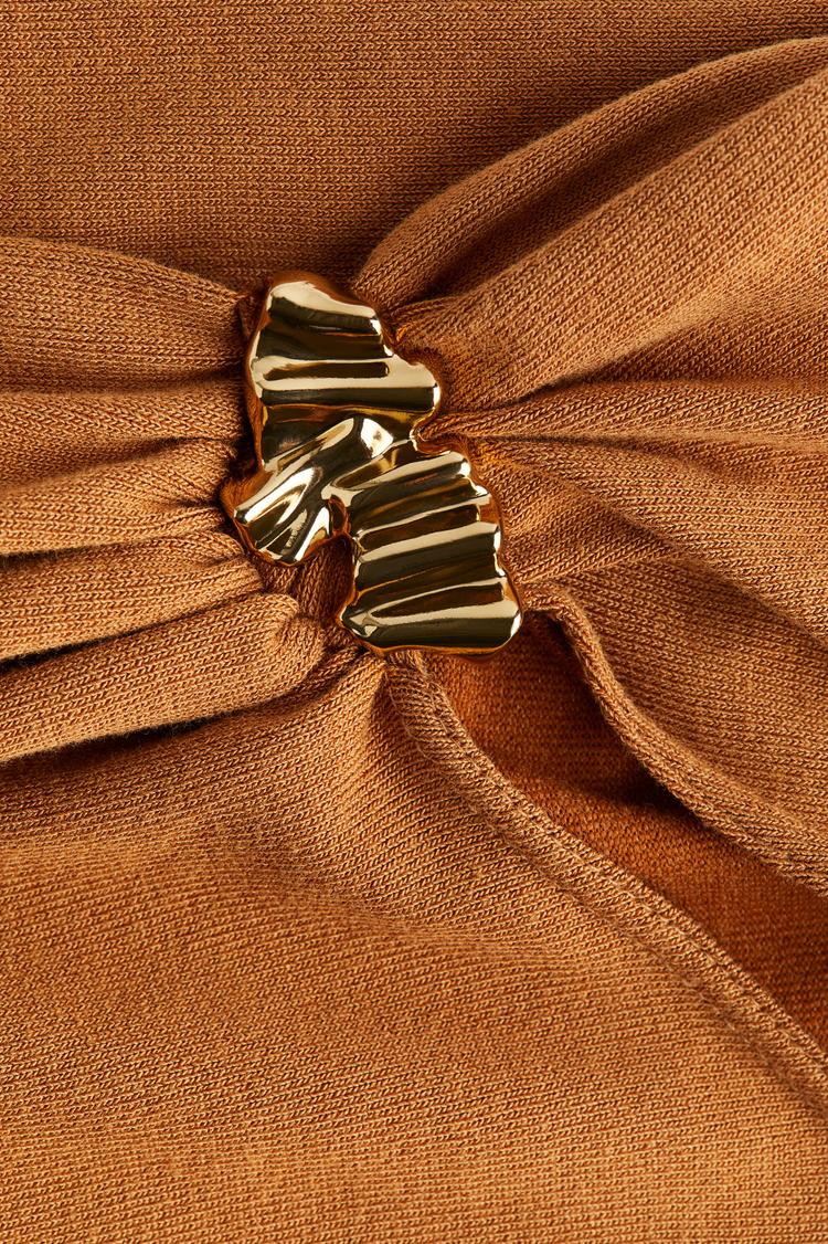 A sleek asymmetric neckline and a chic one-shoulder strap define this fitted waist-length top in a matte tan hue. The modern silhouette is enhanced by a distinctive gold buckle detail on the front, adding an elegant touch to the minimalist design. Perfect for casual outings, brunch dates, or stylish evenings, this versatile piece pairs effortlessly with a variety of bottoms. Its pullover style ensures easy wear, while the sleeveless cut keeps it fresh and contemporary for year-round appeal.