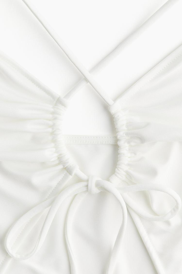 Short, fitted top in soft jersey with short sleeves. Square neckline and partially open back with narrow straps that cross, thread through sides, and tie above waist. Gathered seam above a flared peplum in crisp cotton poplin.