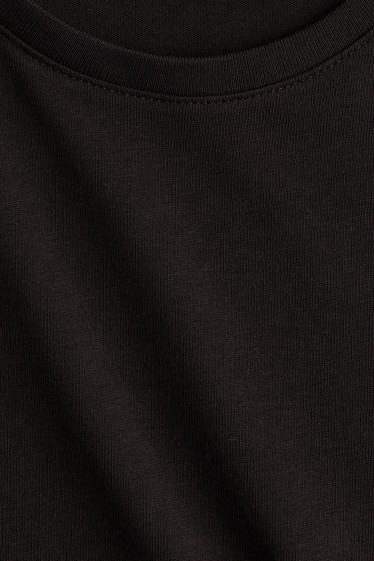 A timeless matte black peplum top crafted from soft cotton offers a flattering regular fit with a classic round neckline and comfortable half sleeves. The subtle ruffle detail at the hem adds a feminine touch to the hip-length silhouette, making it an ideal choice for casual days, professional workwear, or business casual settings. This minimalist and chic top pairs effortlessly with tailored trousers or skirts for versatile styling across seasons.