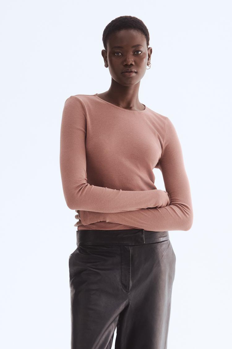 Soft pima cotton in a matte dusty rose hue forms this slim-fit shell top with a classic round neckline and long regular sleeves. The waist-length silhouette and minimalist style make it an ideal choice for everyday wear, casual outings, and workwear settings. Its clean, covered back and subtle seam details add understated elegance, while the breathable fabric ensures comfort across all seasons. This versatile top pairs effortlessly with tailored pants or jeans, perfect for a polished yet relaxed look throughout the year.