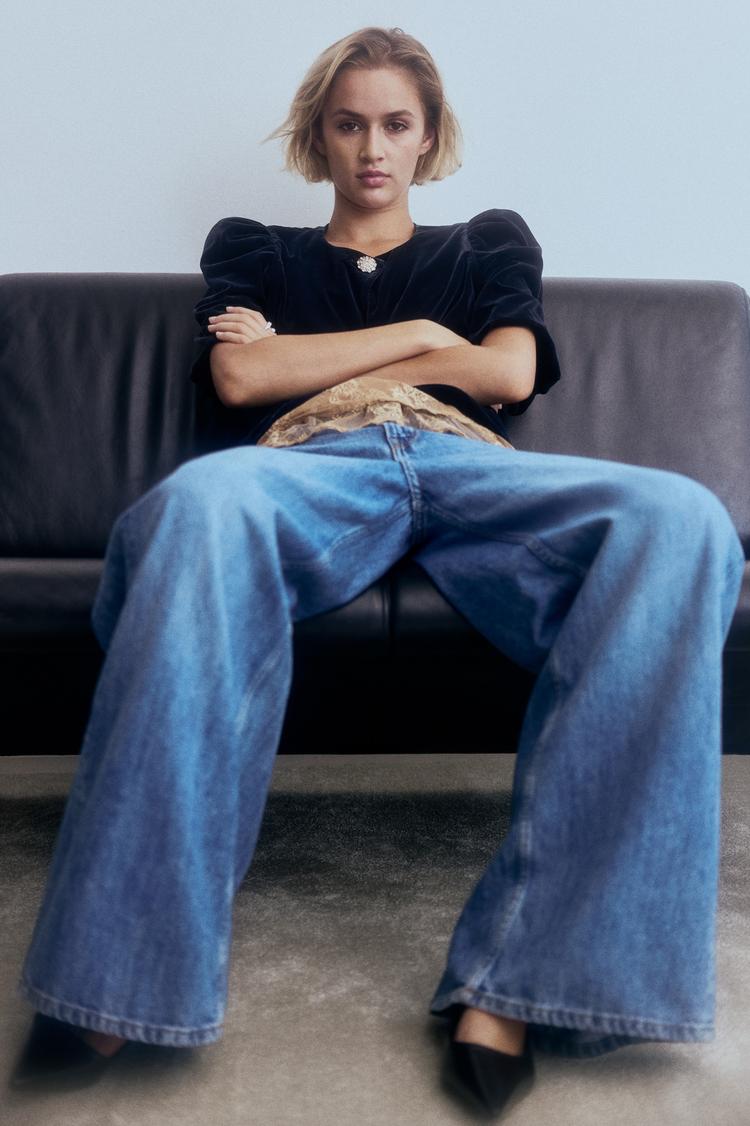 Soft velvet fabric and elegant puffed half sleeves define this blouson top in a rich dark blue hue. Featuring a relaxed fit and classic round neckline, it is detailed with a standout gold decorative button at the front for a touch of sophistication. The hip-length silhouette makes it versatile for casual, everyday wear or brunch gatherings. Pair with jeans or tailored pants for a timeless, minimalist look that blends comfort and refined style effortlessly.