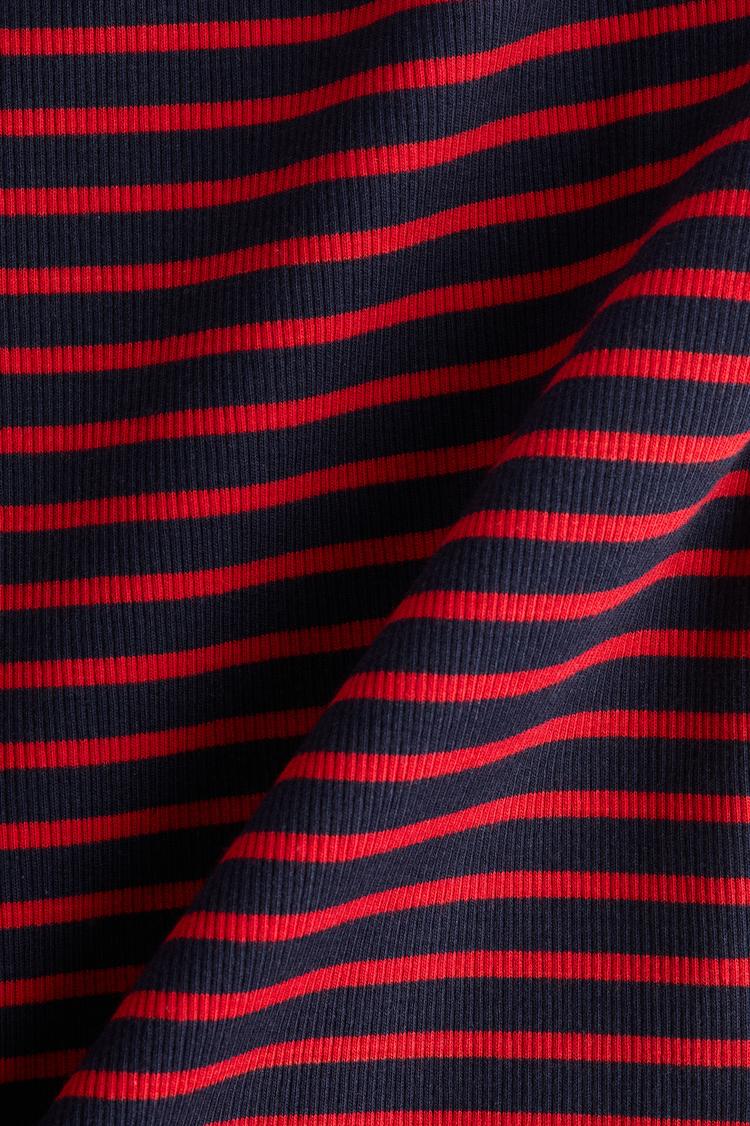 Ribbed texture and a slim fit define this classic boat-neck shell, featuring long sleeves and a hip-length hemline. The all-over striped pattern in rich matte dark blue and vibrant red stripes adds timeless appeal. Crafted from soft rib knit fabric, it offers comfortable wear for everyday, casual, or business casual settings. Its minimalist style and covered back make it a versatile piece suitable for workwear, casual outings, or relaxed weekends.