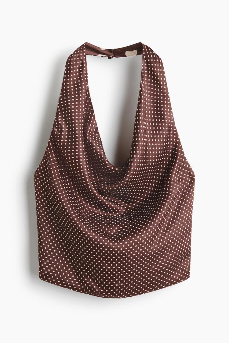 Soft matte brown satin fabric with an elegant off-white polka dot print creates a chic halterneck tank top designed for warm seasons. The sleeveless, slim fit silhouette features a draped front and an open back with a tie-up closure, adding a modern, sophisticated touch. Perfect for casual outings, date nights, or night out events, this hip-length top blends vintage-inspired print with contemporary style and luxurious satin comfort.