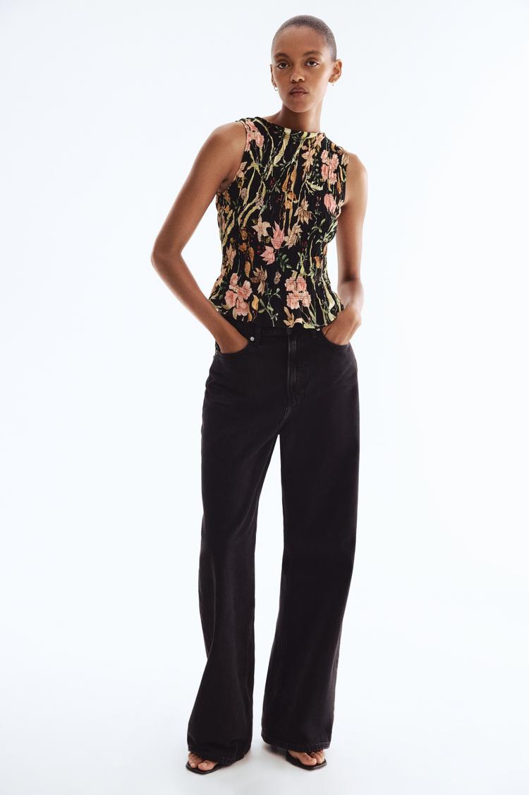 Soft smocking and a fitted silhouette define this sleeveless top in a matte black base adorned with a muted floral pattern in dusty rose, beige, and green. The wide straps and round neckline add to its casual chic vibe, making it an ideal choice for spring and summer outings. Its waist-length cut pairs effortlessly with high-waisted jeans or skirts, perfect for everyday wear, brunch dates, or casual gatherings where comfort and style meet.